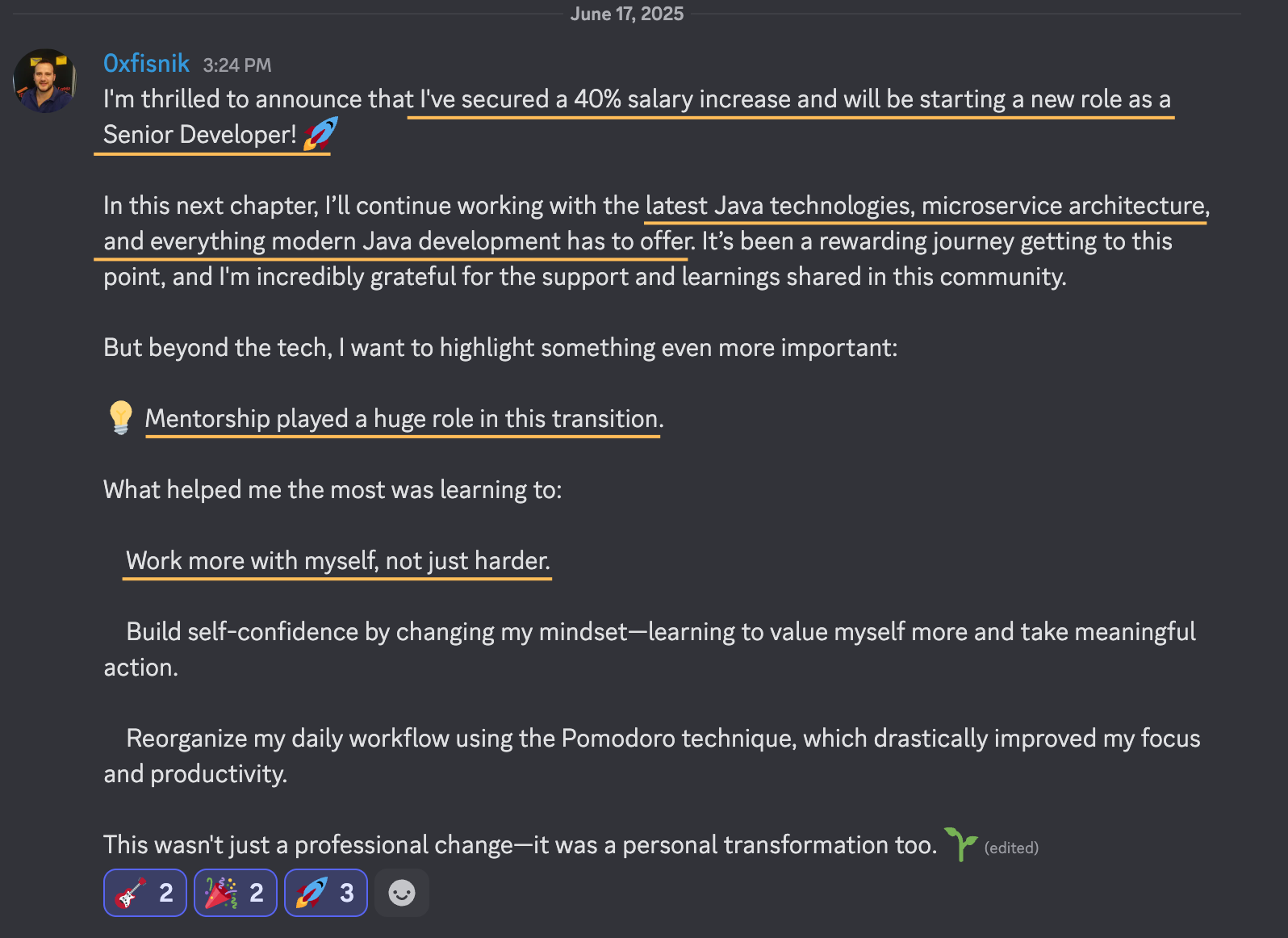 Combined, these developers increased their yearly compensation by over half a million dollars within months, not years. Most results were achieved while working full‑time, without quitting jobs or relocating blindly. Most started from stagnation, self‑doubt, or a lack of clear direction.